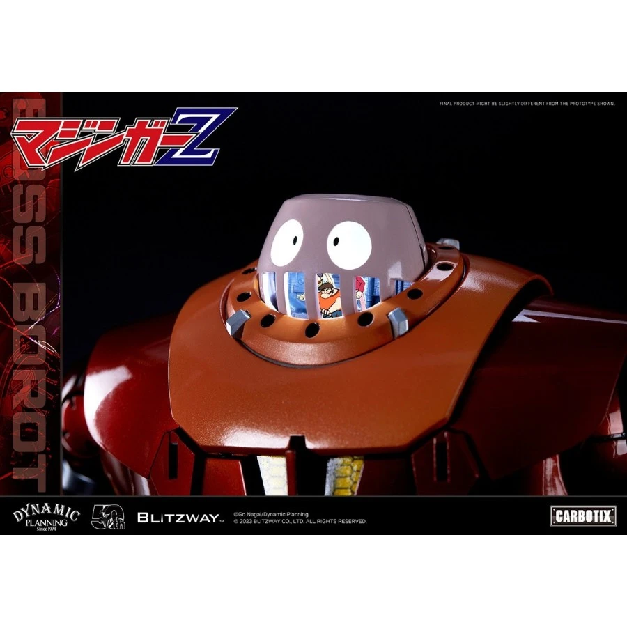 Boss Borot tratto da Mazinga Z entra nella line-up Blitzway Blitzway Carbotix Hybrid Carbon Action Figure Series, azione completa alto 20.5cm. Realizzato in ABS, PVC, POM, metallo die-cast e presenta un sistema di illuminazione LED nella testa. Viene fornito con 4 volti intercambiabili, 6 mani intercambiabili, missili, fionda, cesto, maschera da sub, pinne da sub e 3 mini figure di Boss, Nuke e Mucha.